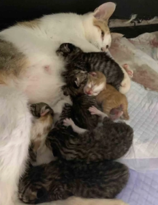 Despite her advanced age, she had four boys and four girls and proved to be an excellent mother. There were five tabbies, two gingers, and one calico, all of them were just stunning.