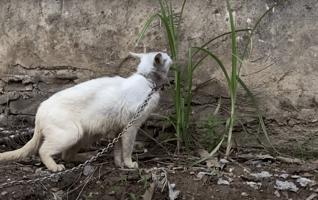 A white cat, visibly malnourished and weak, chained to a concrete slab and left to survive on nothing more than grass.