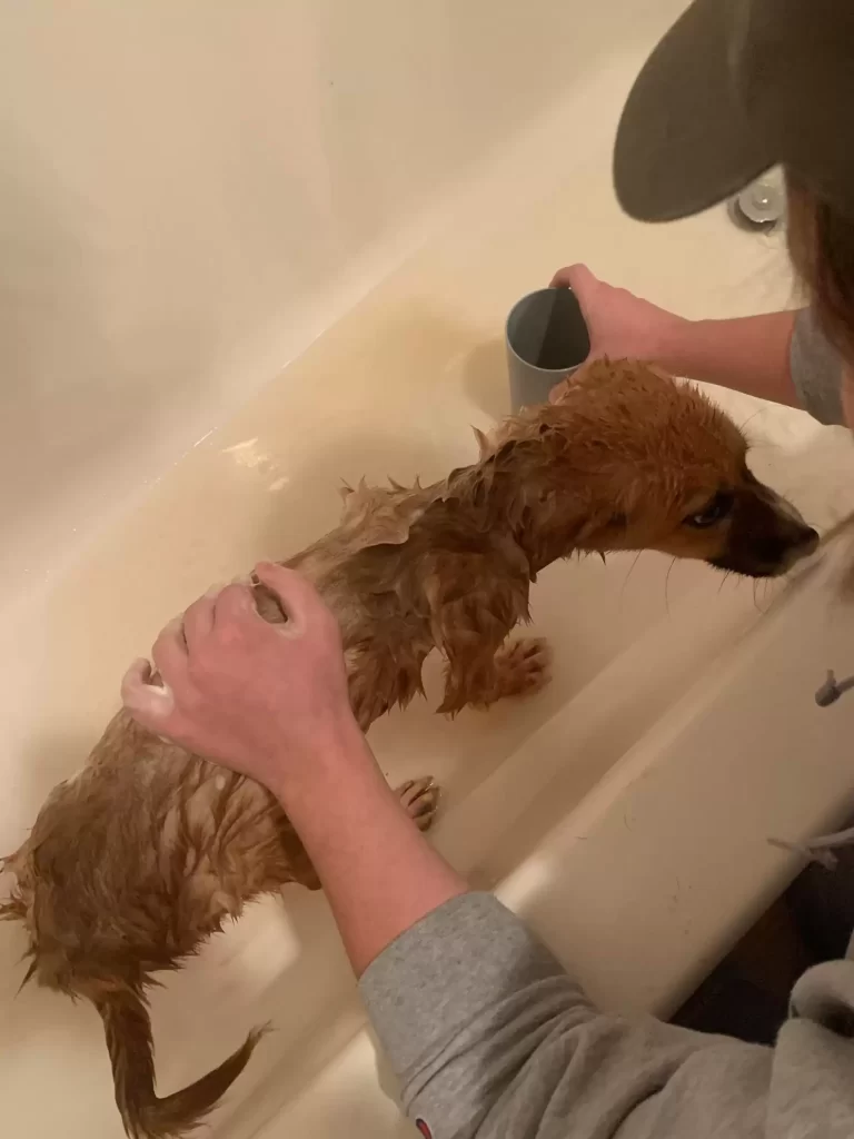 Bath time revealed the truth of Bonnie’s suffering. As the water ran brown with dirt, the thirsty dog tried to drink from the stream.