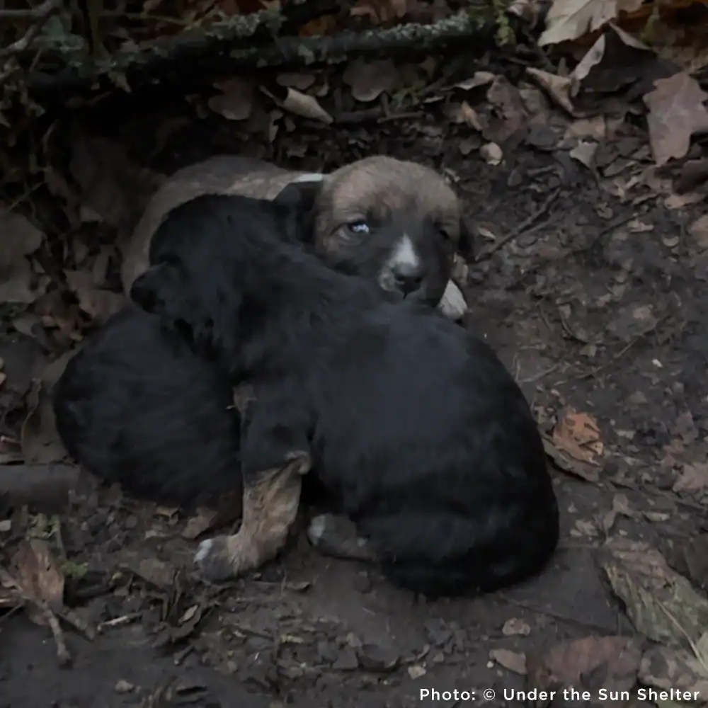 Rain began to fall harder, soaking the ground and chilling the puppies even more.