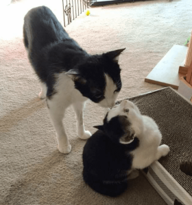Zeke has been well cared for, and his disability no longer hinders him. He interacts with other cats and jumps when his legs don’t work as well as others’.