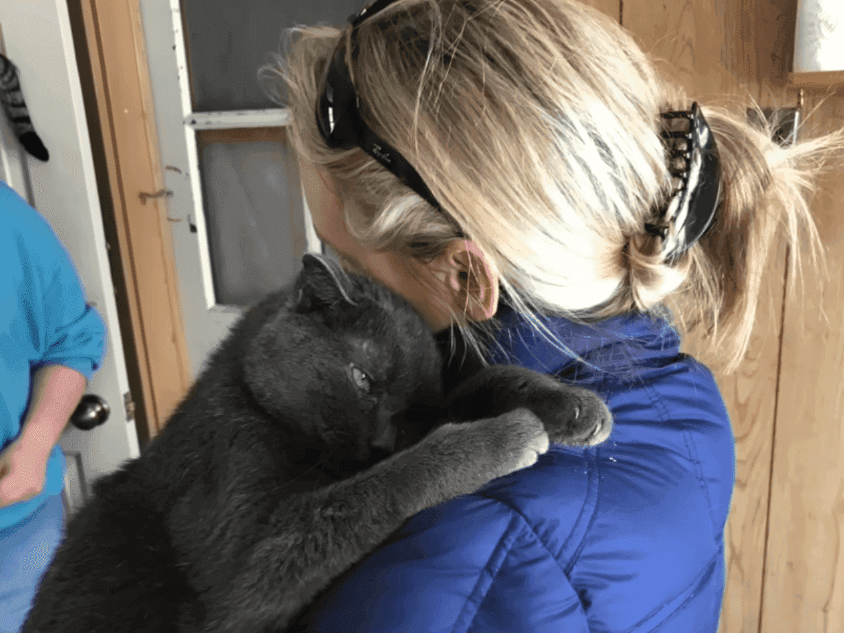 Bruiser was different. The moment Lawrence entered, he climbed straight up her body, wrapped his paws around her neck, and held on tight.