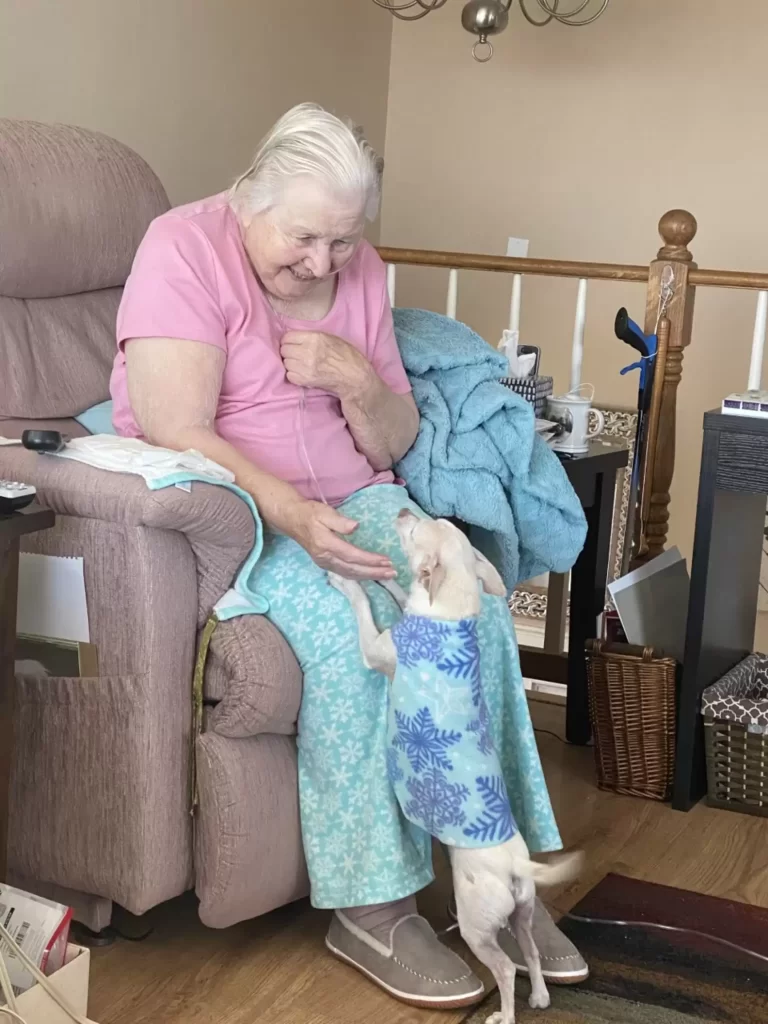Once unwanted, he is now spoiled, adored, and completely secure. Debbie laughs that he has become a true couch potato, the perfect partner for her mom’s slower pace.