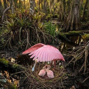 In the warm coastal wetlands of the Americas, this blush-pink wader moves through shallow water with slow, sweeping grace. It feeds by gently swinging its broad spoon-shaped…