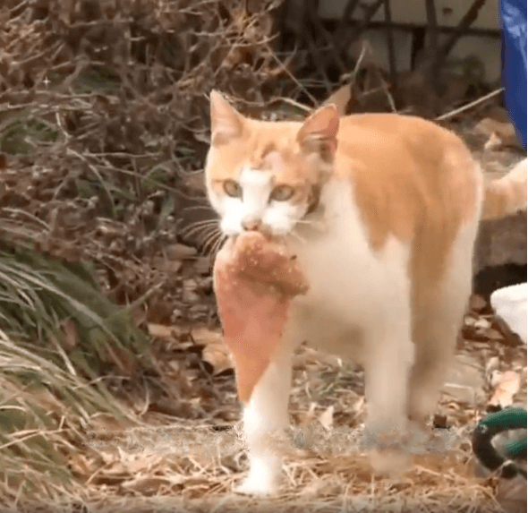 “We saw her every day, carrying pieces of chicken larger than her own head,” one resident said, puzzled by the cat’s strange behavior.