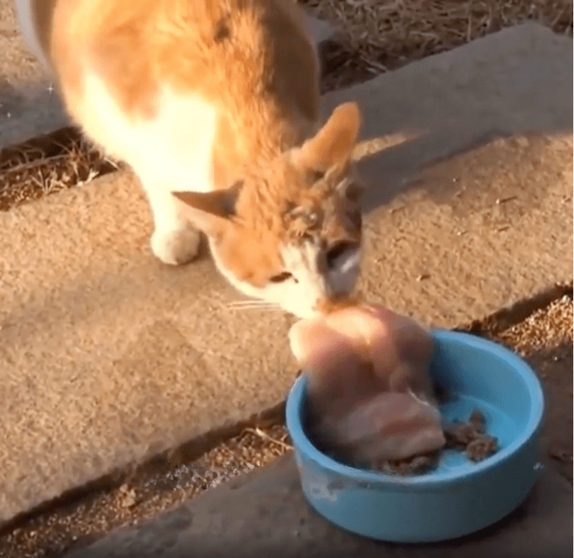 At first, it seemed like a case of theft. The cat’s fur was ragged, bearing the marks of a life lived on the streets, and her mission appeared to be clear: steal chicken.