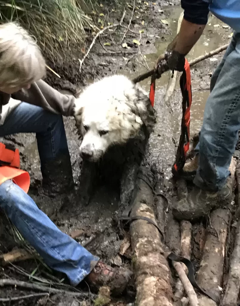 Jim quickly laid branches across the muck to get closer without sinking. Together with Puppy’s family, he tried pulling the 150-pound dog out.