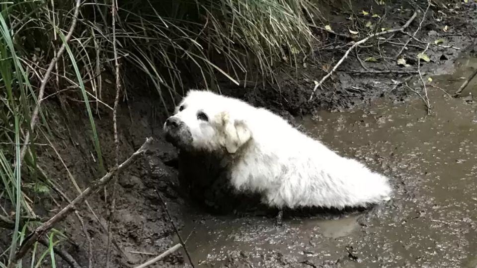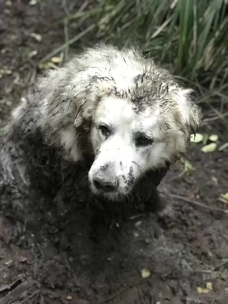 At first, they thought it was debris. But then came a faint whine. Two-thirds of Puppy’s body was buried in thick mud, his white fur stained dark.