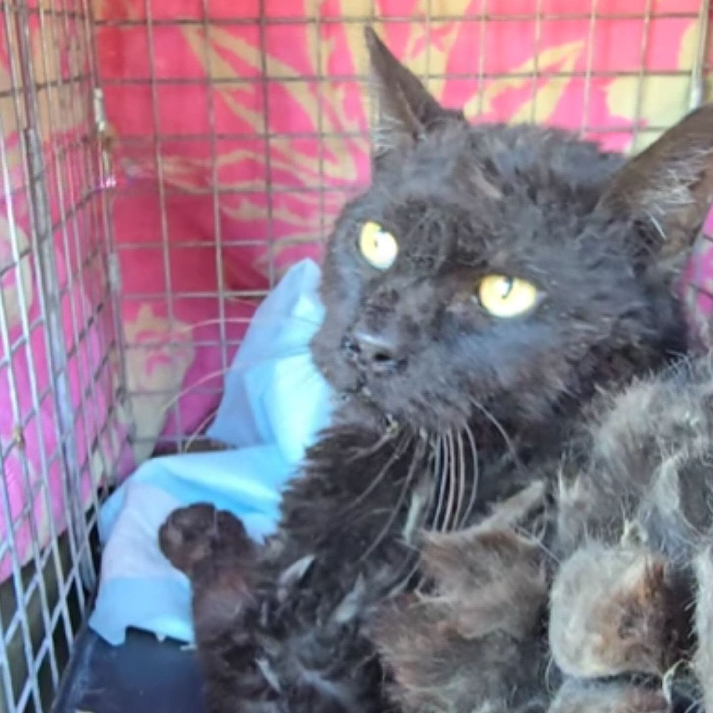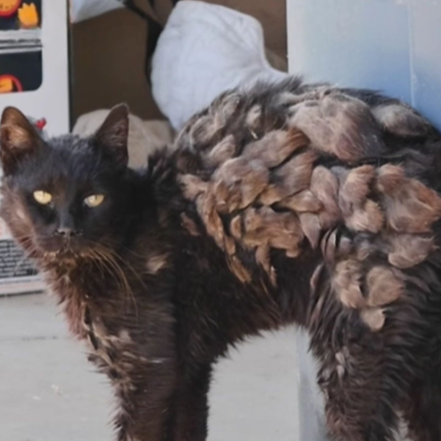 The cat’s fur was a complete mess thick clumps of knots covered most of his body, pulling tightly on his skin and making every movement look agonizing.