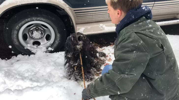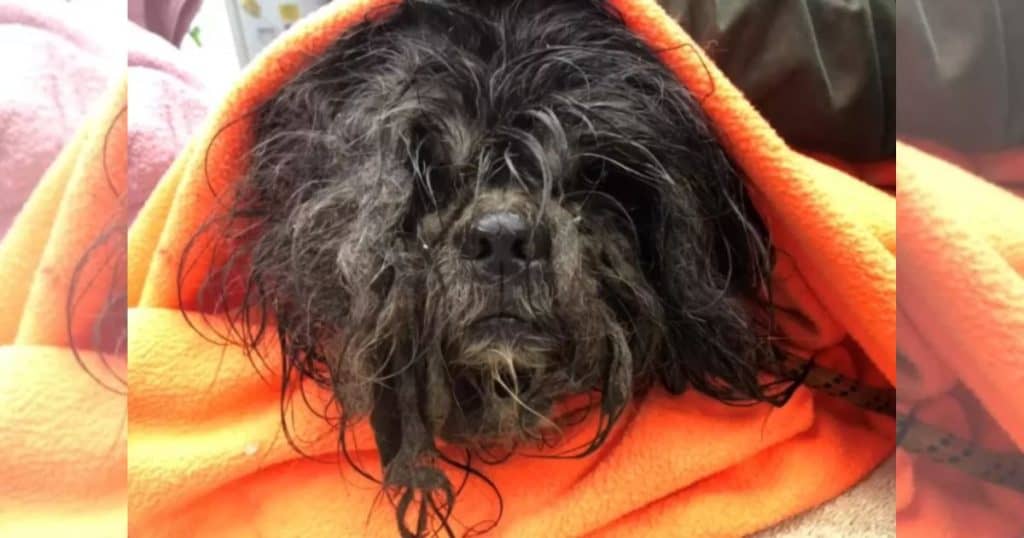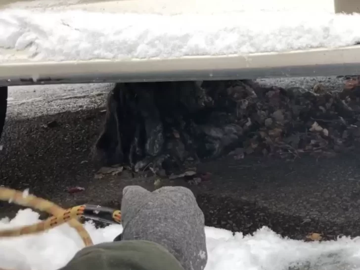 Upon closer inspection, Lochmann realized the furry heap was a dog in terrible condition. His mats were so heavy that they pulled at his skin, and he was soaked from the snowstorm, his fur frozen to the concrete.