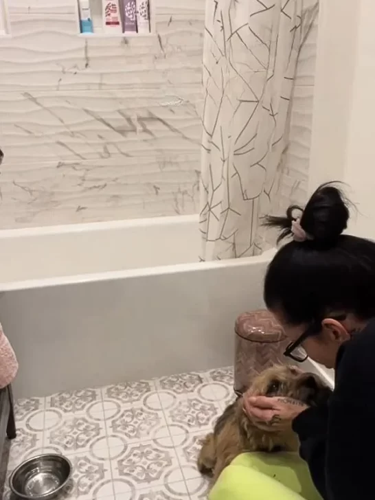 After Bitsy finished eating, Daniela took her to the bathroom and gave her a warm bath.