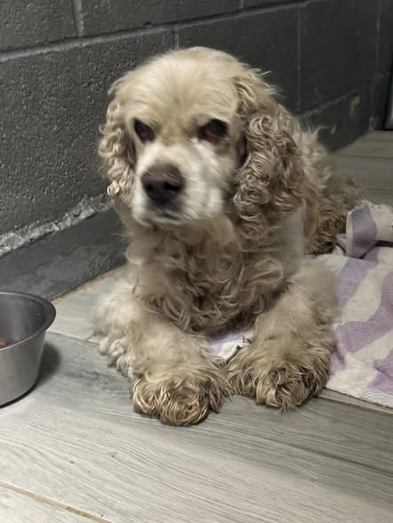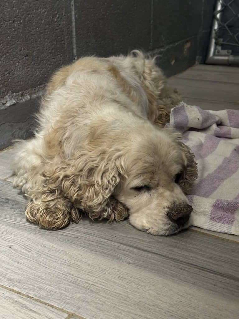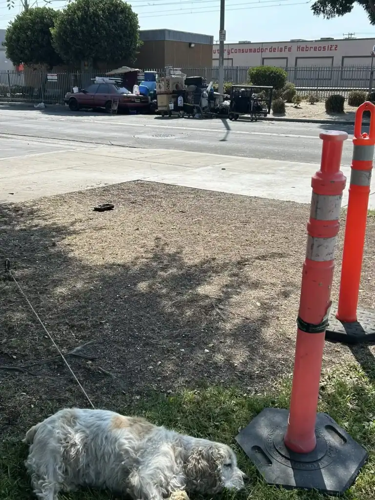 For two long days, an old cocker spaniel lay tied to an orange cone, waiting for someone to notice him.