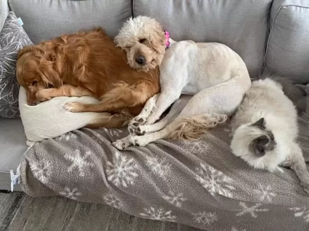 She followed her new family from room to room, eager to be close, and found comfort lying beside her two new dog siblings — and even the family cat.