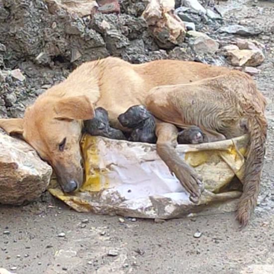 A tiny mother dog lay in the dirt with her newborn puppies tucked tightly against her chest.