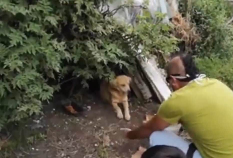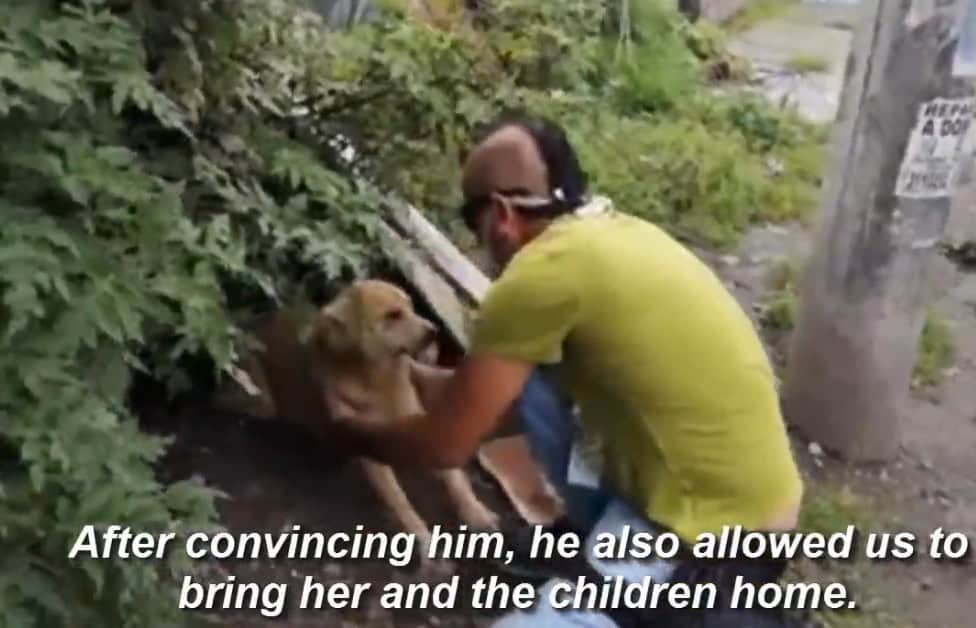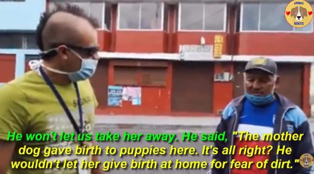 The mother dog looked confused as they knelt beside her.