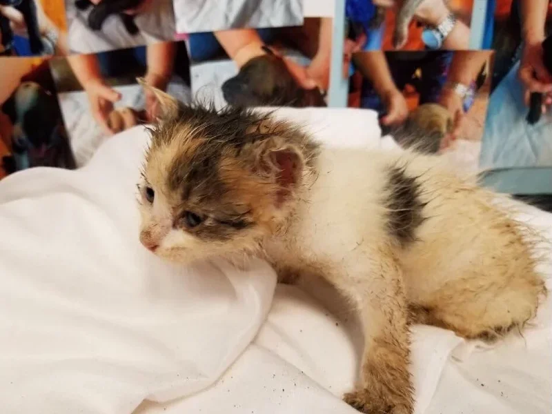 The tiny calico, now safe in loving hands, was transferred to a nearby shelter for medical care.