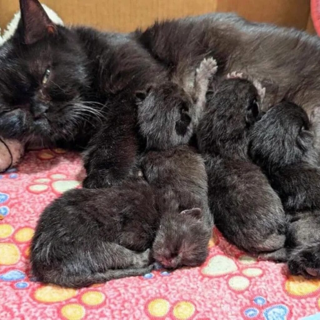 Celine, a volunteer from the shelter, explained that the black cat spent much of her early days simply sleeping, building up energy while she waited for her kittens to arrive.