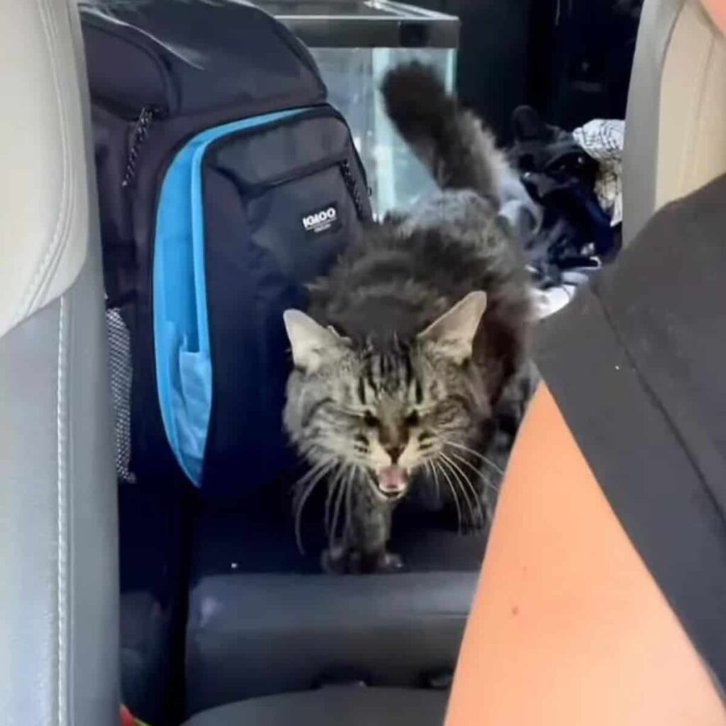 In the car, the cat climbed straight onto Meagan’s lap, nudging and head-butting as if she was saying thank you over and over again.