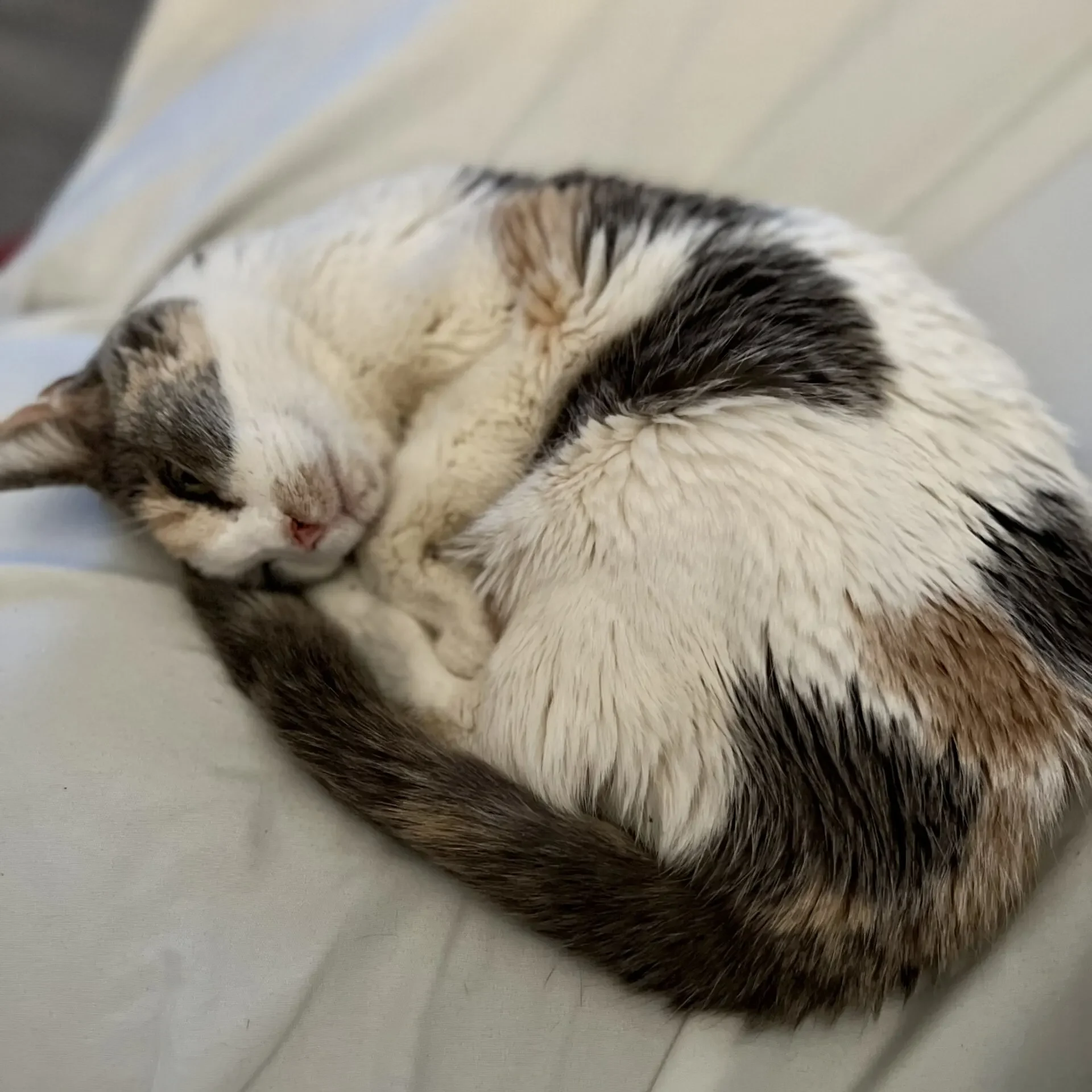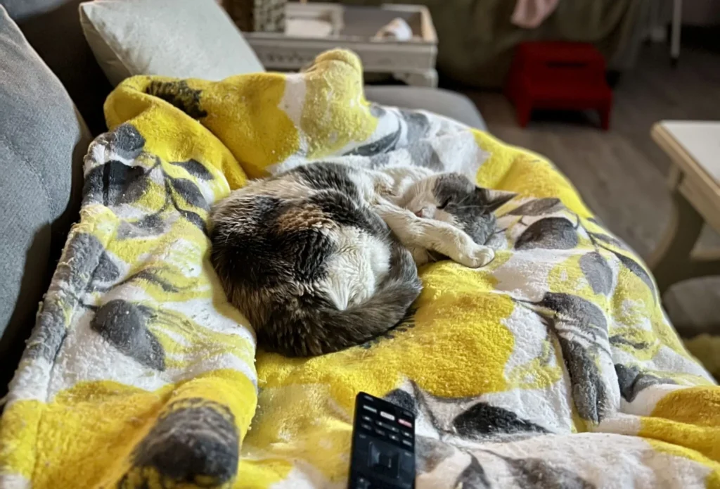 Today, she spends her days napping in cozy blankets, gazing out the window, and soaking up every bit of love she receives.