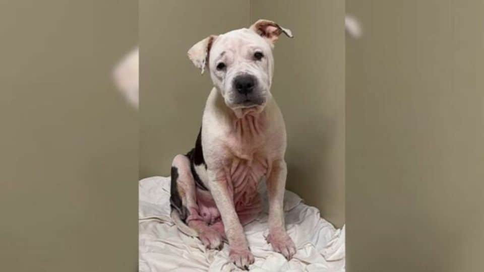 She was much too thin, her ribs faintly visible beneath her coat. Patches of irritated skin and the raw signs of infection made her flinch when touched.