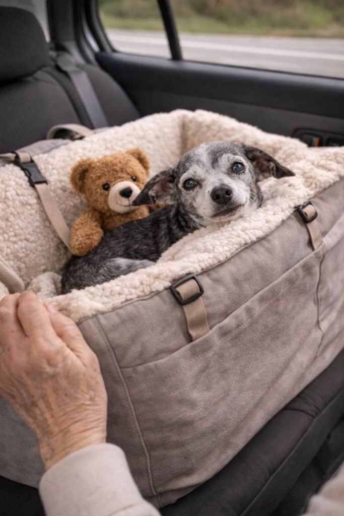 In the car, the woman placed a soft blanket on the seat.
