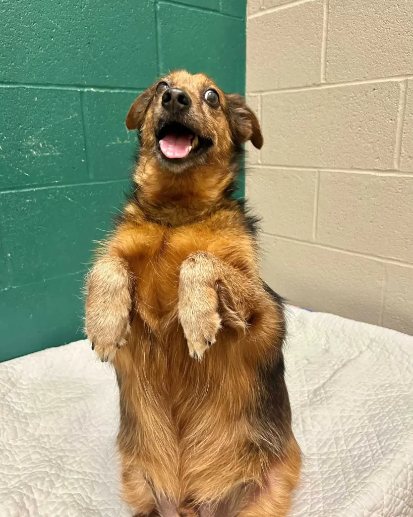 One afternoon, while a volunteer was cleaning his kennel, Banjo suddenly lifted his front paws and sat upright, balancing like a little statue. Everyone burst out laughing — it was the cutest, strangest thing they’d ever seen.