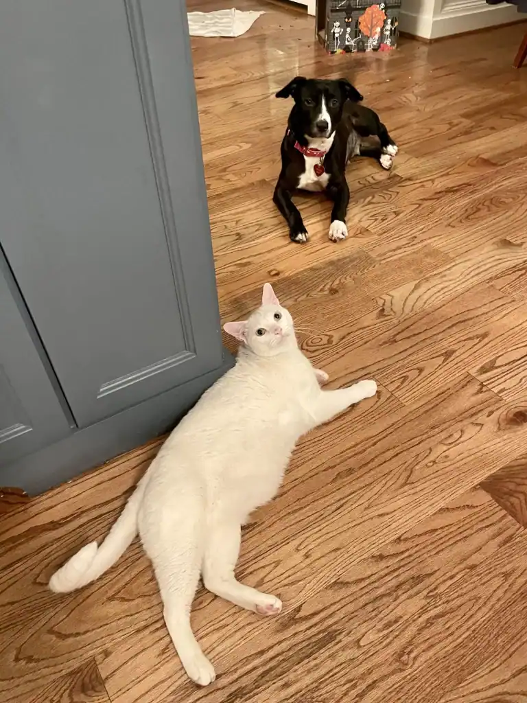 She runs beside her dog sister and pauses at the quiet memorial shelf of the cat who once shared his home with her.