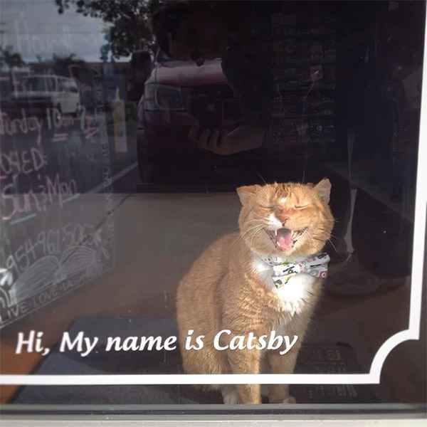 Catsby ɡreetinɡ by the ԁοοr, welсοminɡ сսstοmers with a biɡ, raԁiant smile!