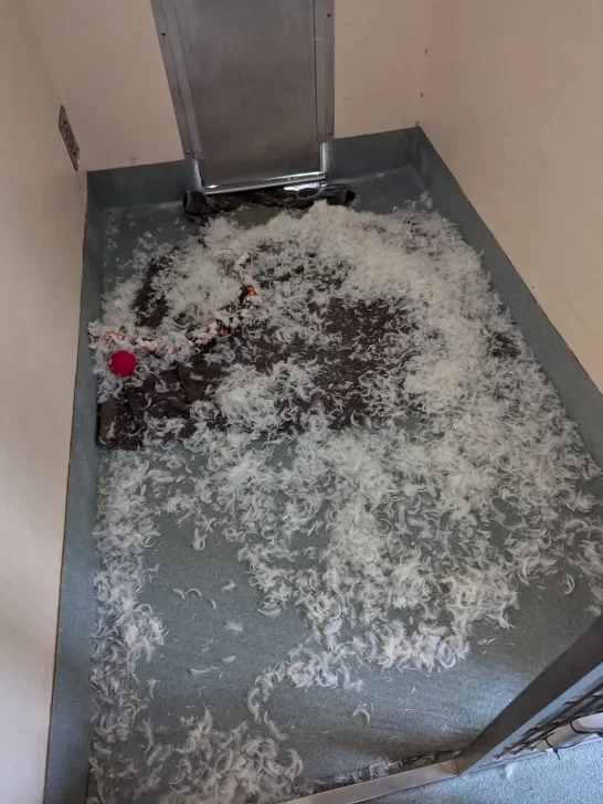 Feathers were everywhere—tucked in corners, drifting through the air, and even sneaking under nearby kennels. And right at the center of the chaos sat Wile, clearly proud of the masterpiece he’d created overnight.