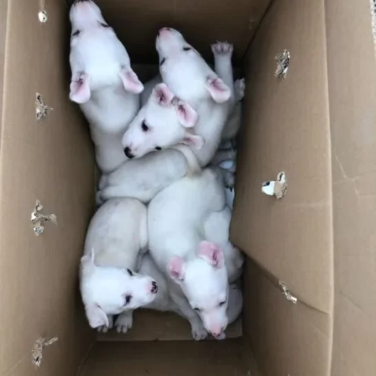 Inside, they found a litter of tiny white puppies with sad, dejected faces.