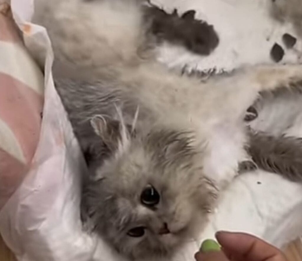 Still too weak to stand for long, the cat began to show signs of recovery under the loving watch of the rescue team.