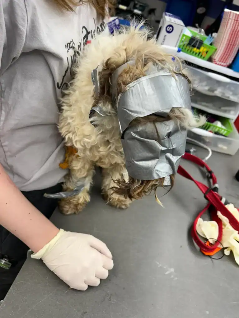 There, inside the dark container, lay a small dog wrapped in heavy duct tape from head to tail.