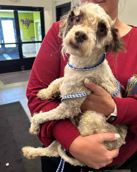 Humane Society staff told her how they had shaved him to remove the debris stuck in his fur.