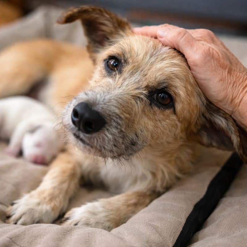 She knelt beside the mama dog.