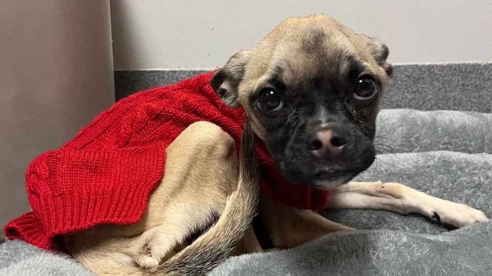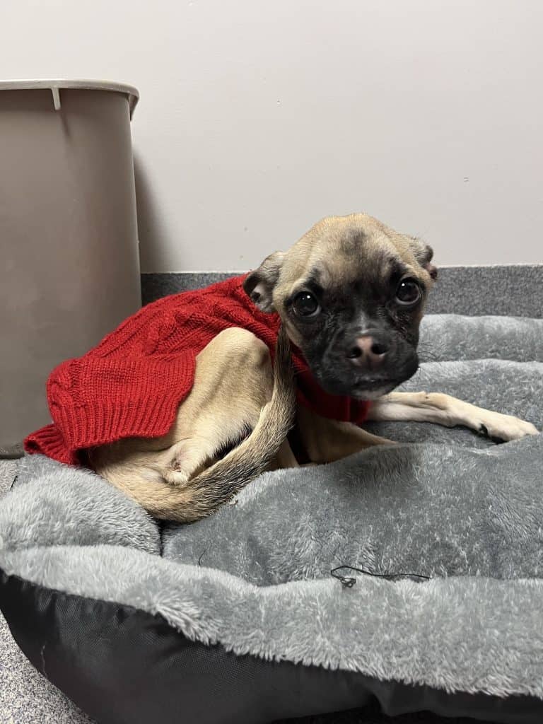 The shelter joked that she looked like a baby doll ready for a walk outside.