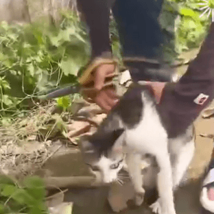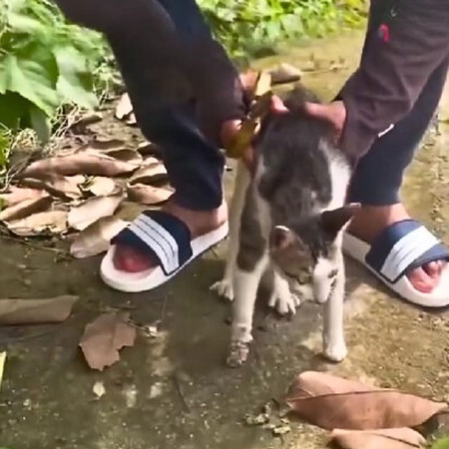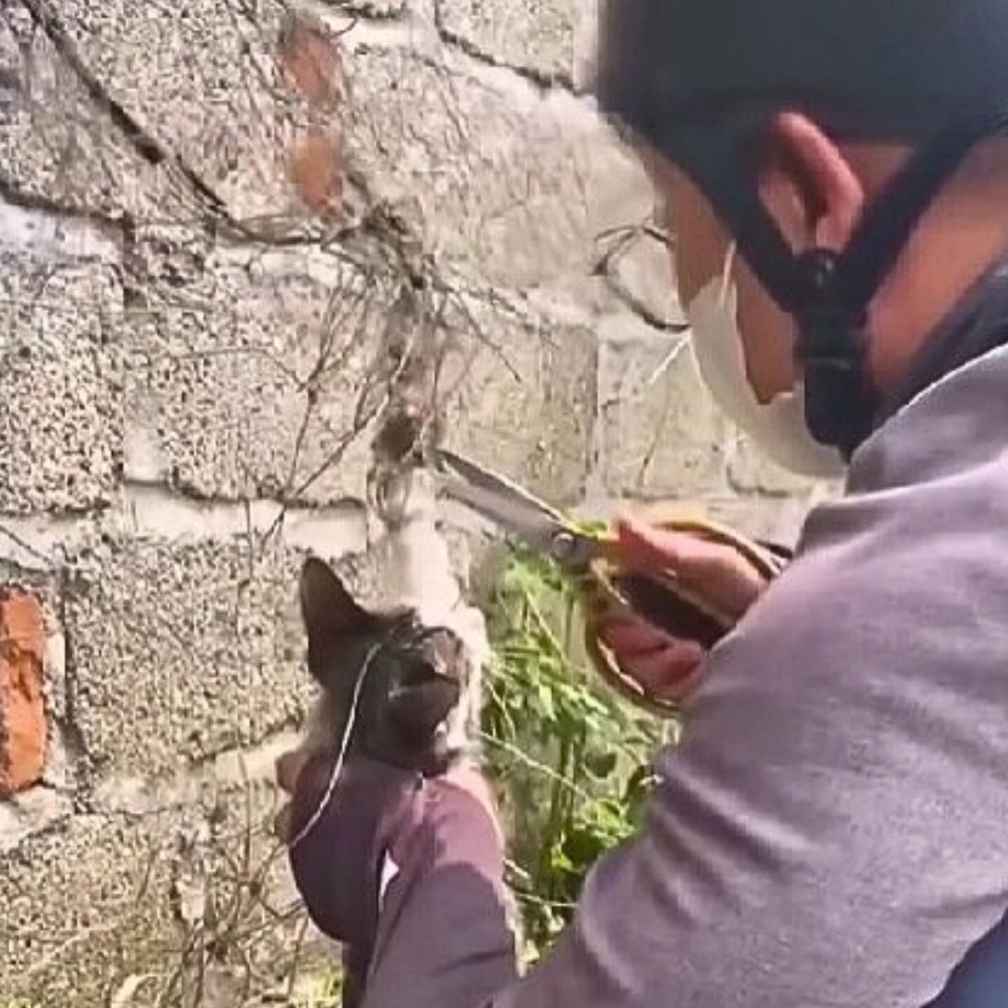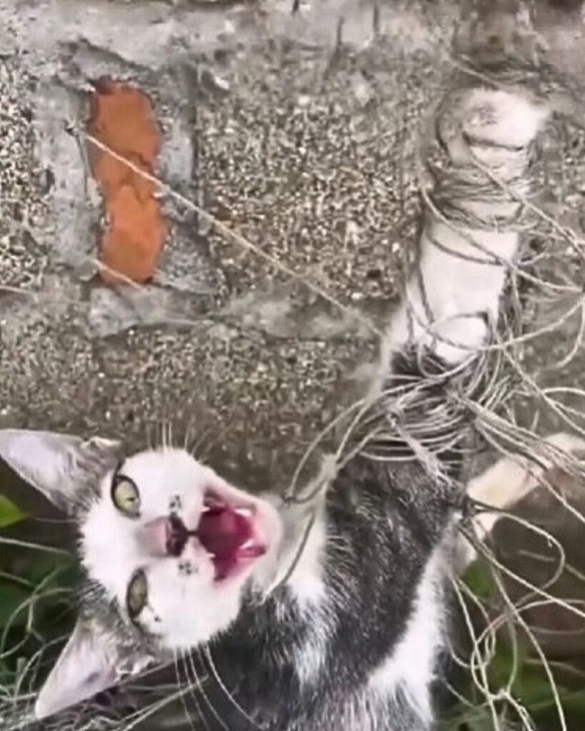 It shows a cat in serious trouble, the kind that could have ended very badly if it weren’t for the quick thinking of one passerby.