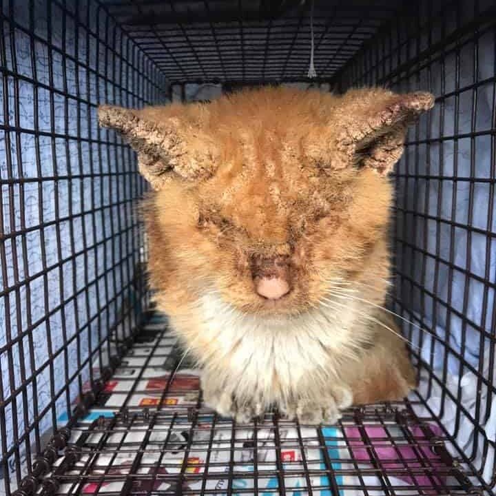 His fur had almost disappeared, replaced by hardened scabs, and he could barely open his eyes.