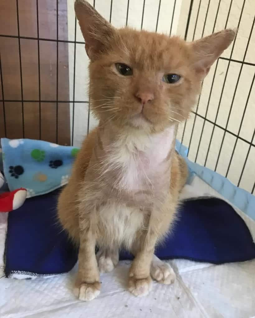 When she arrived at the house, she immediately spotted him, a thin, orange cat with his skin covered in thick, crusty patches of mange.