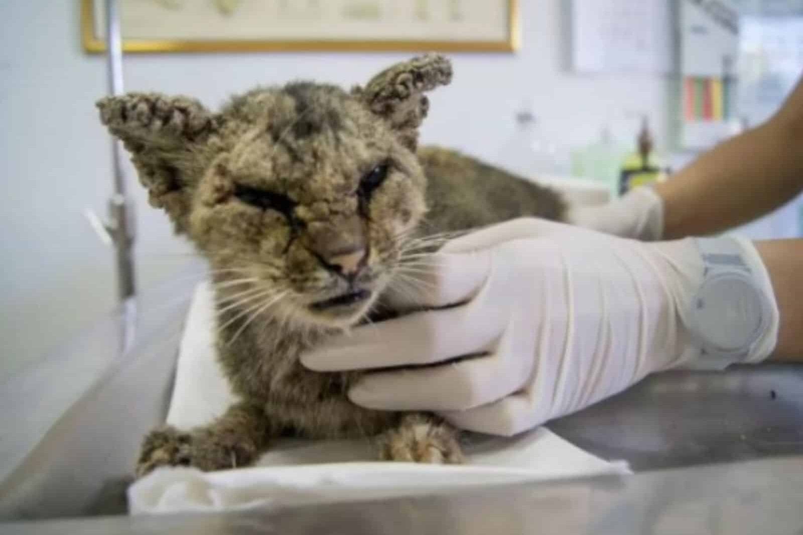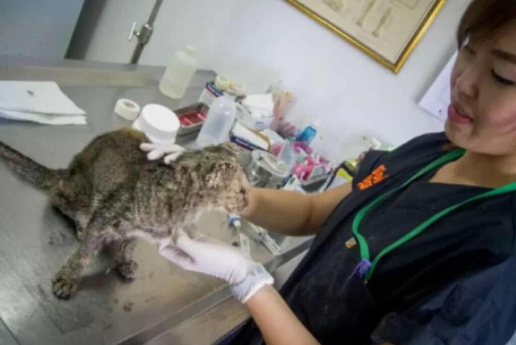 The cat was dehydrated, malnourished, and too weak to eat properly.