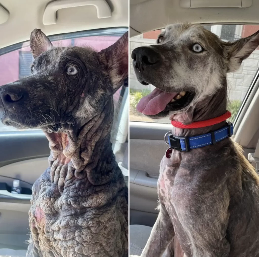 The animal was covered in scars and scabs, nearly hairless, and struggling with severe skin damage. His condition was so bad that it seemed his skin had turned to stone, a heartbreaking sight that spoke volumes about the pain he had endured. Stray Rescue of St. Louis wrote.