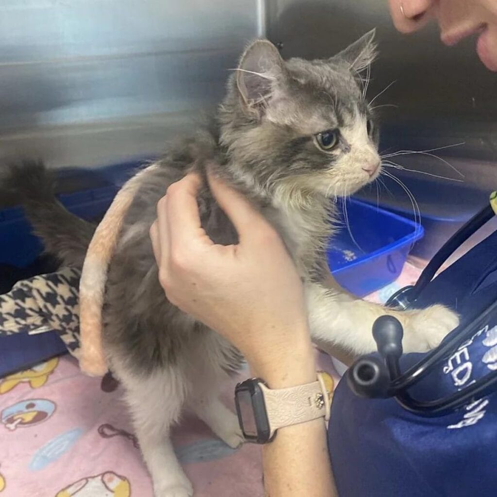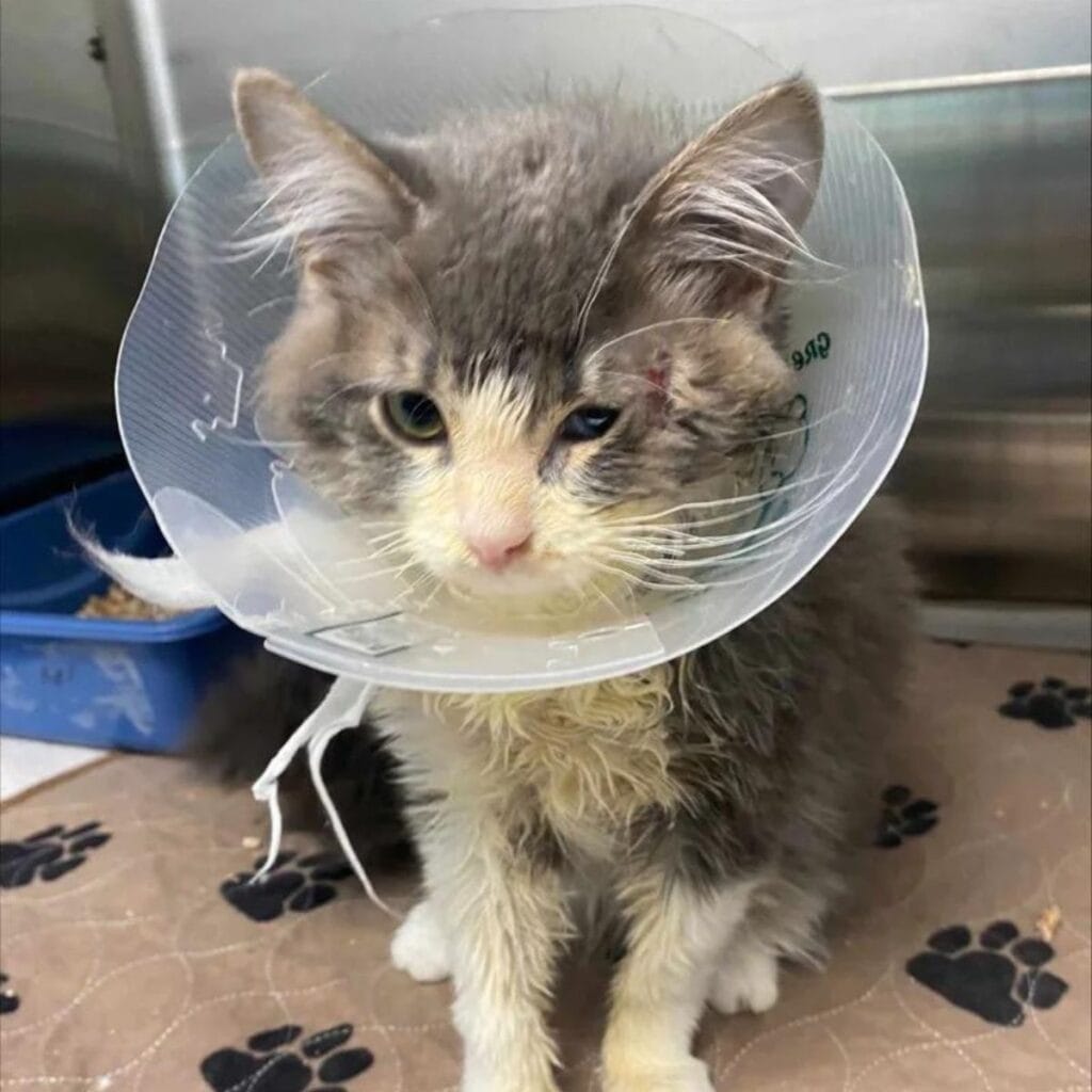 The little kitten, later named Tom, had clearly endured something terrible before reaching the safety of the shelter.