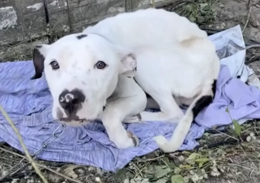 On the porch of an old boarded-up house, he saw a thin white dog sitting motionless, chained to a rusted railing. The animal’s ribs were visible through his fur, and the chain was so short that he could barely move.