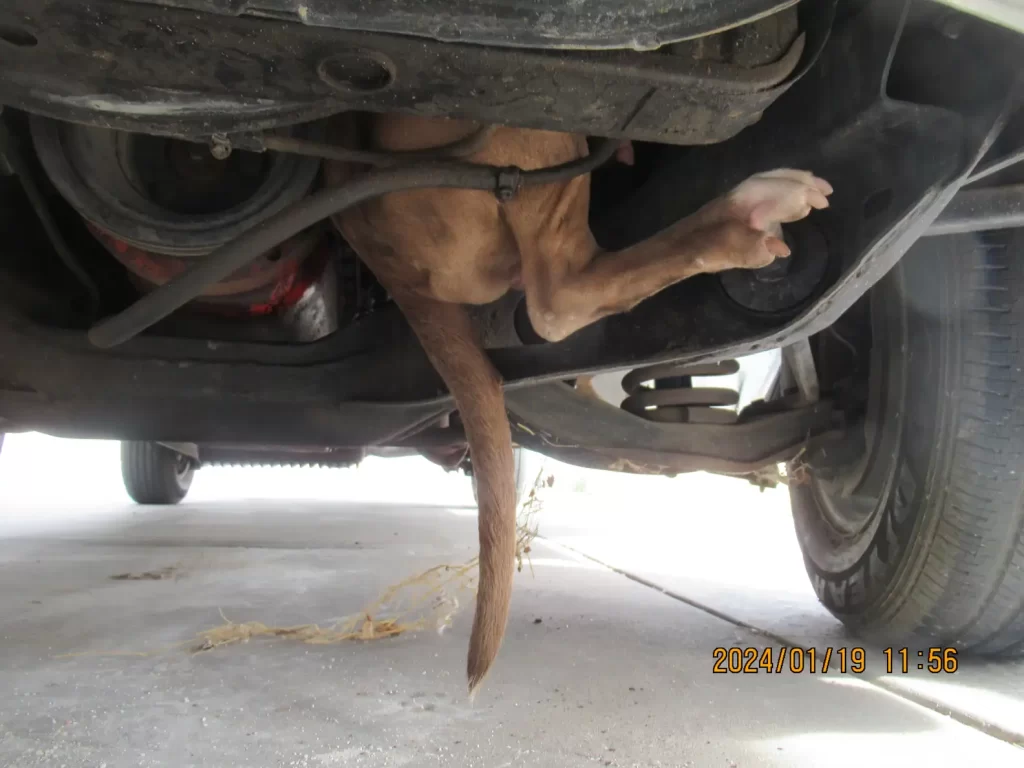 It wasn’t a stray cat or even a small puppy. It was the unmistakable leg of a dog wedged tightly into the engine area.