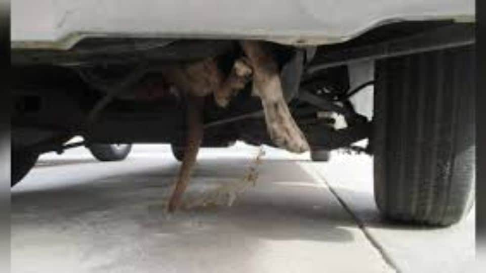 That’s when she noticed something that made her gasp — a paw and a tail were sticking out from the underside of the vehicle. For a moment, she couldn’t believe what she was seeing.