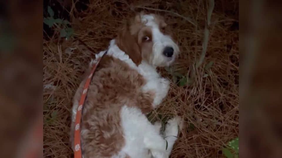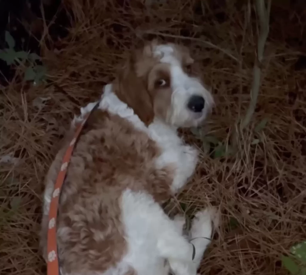Confused and heartbroken, the brown-and-white pup wandered aimlessly beneath the tall pines, searching for the person who had vanished without a trace.