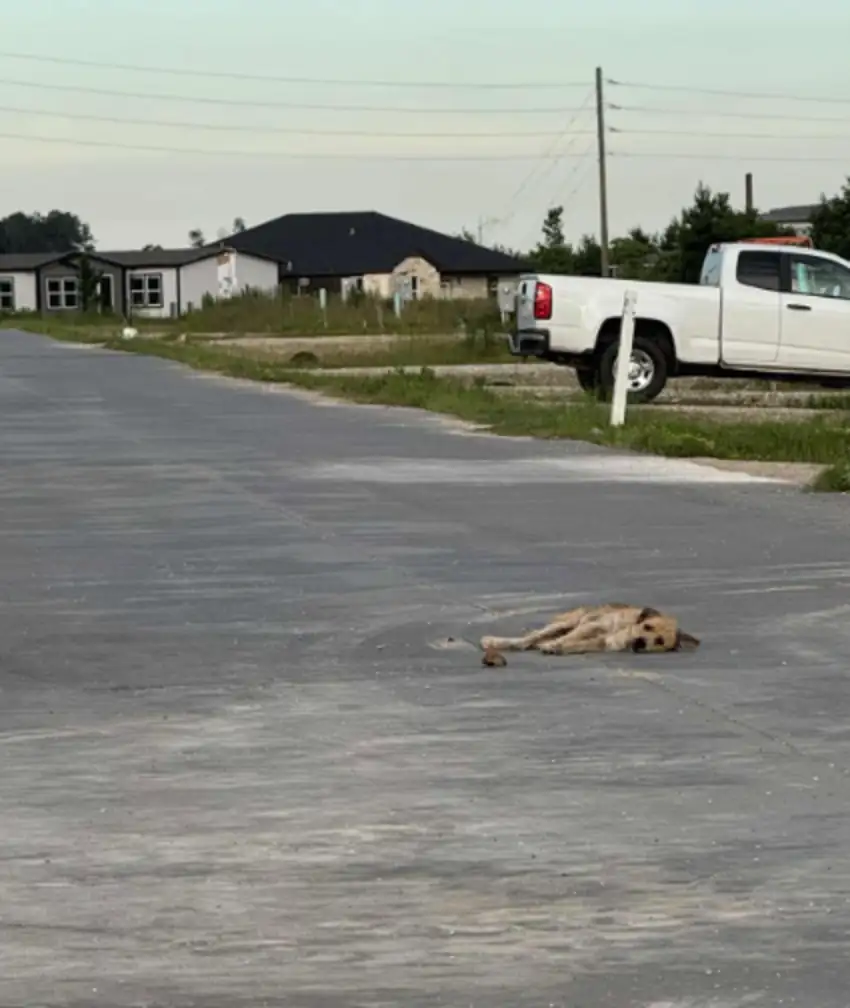 One warm afternoon, his strength finally gave out. Right in the middle of the road, the dog lay down, too weak to move another inch.