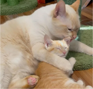 Domestic cats raised kittens, taught them cat manners, and licked a lot. The kittens relished their elders’ presence and accepted their care with a roar of appreciative purring.