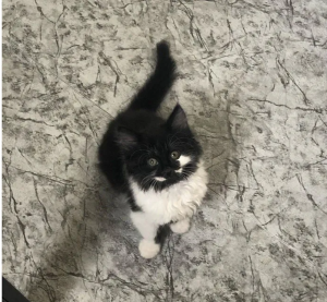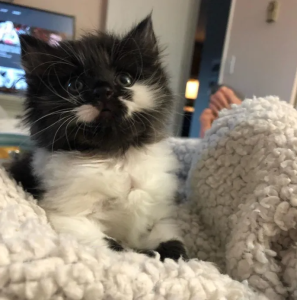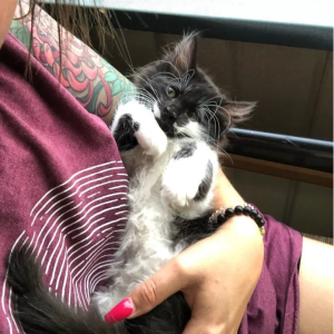 Maisie, a black and white kitten, is the only one that has survived. “The infant was really feeble, and she was dangerously deficient in mother’s milk for the first two days,” Danika explains.