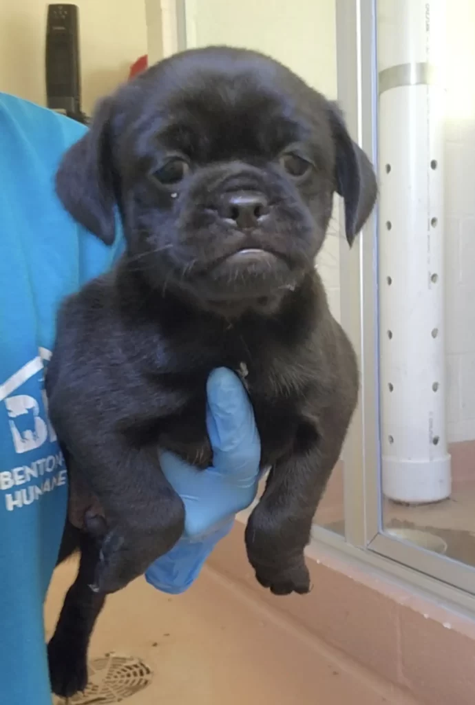 But one puppy remained. His name was Mugsy — a little black pup who looked just like his mom. One morning, he woke up to find his whole family gone, leaving him alone in the shelter for the first time in his life.