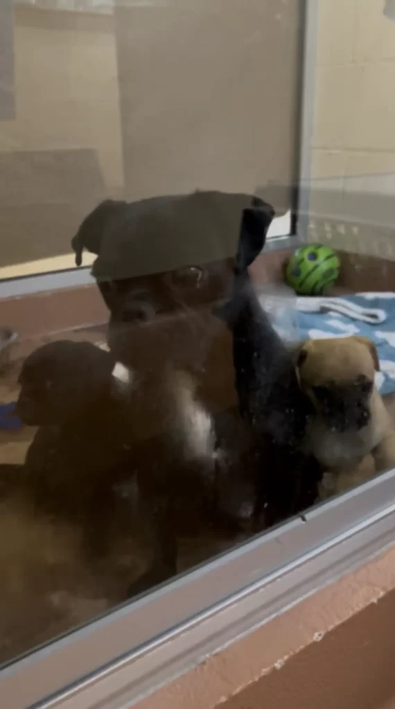 The mother dog, gentle and patient, cared for her tiny pug-mix puppies with so much tenderness that staff members often stopped just to watch them together.